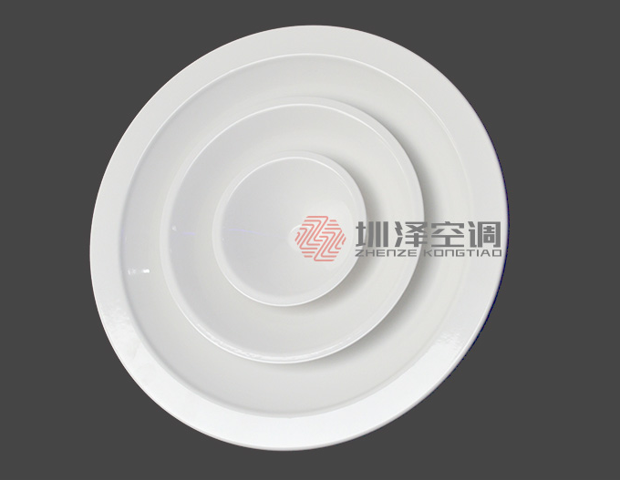 圓形散流器一般用于冷暖送風(fēng)。通常安裝在頂棚上。其吹出氣流呈貼附(平送)型,其結(jié)構(gòu)為多層錐面形。由于室內(nèi)誘導(dǎo)氣流大于排風(fēng)量,因此吹出氣流減速較快。因此相對(duì)任意大小面積來(lái)說(shuō)可以供給較大風(fēng)量,而且在給定的風(fēng)量范圍內(nèi)擴(kuò)散半徑的大小變化.